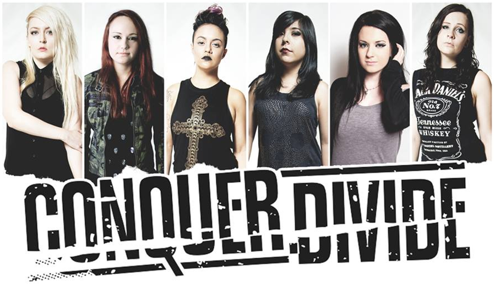 Conquer Divide is an all-female rock/metal group that consists of (left to right): guitarist, Kristen Waters; drummer, Tamara Tadic; clean vocalist, Kiarely Castillo; screamer/unclean vocalist, Janel Duarte; bassist, Ashley Colby; and guitarist, Izzy Johnson.
