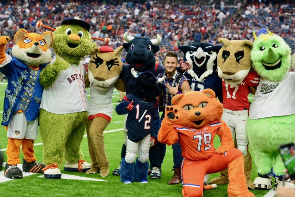 "I played football with a bunch of other weird mascots at NRG Stadium at the Toro's Mascot Bowl! SFA and SHSU sent members of their cheer and dance team to promote the Battle of the Piney Woods game. At halftime, SFA's Lumberjack and I went down to the field and met up with Toro.