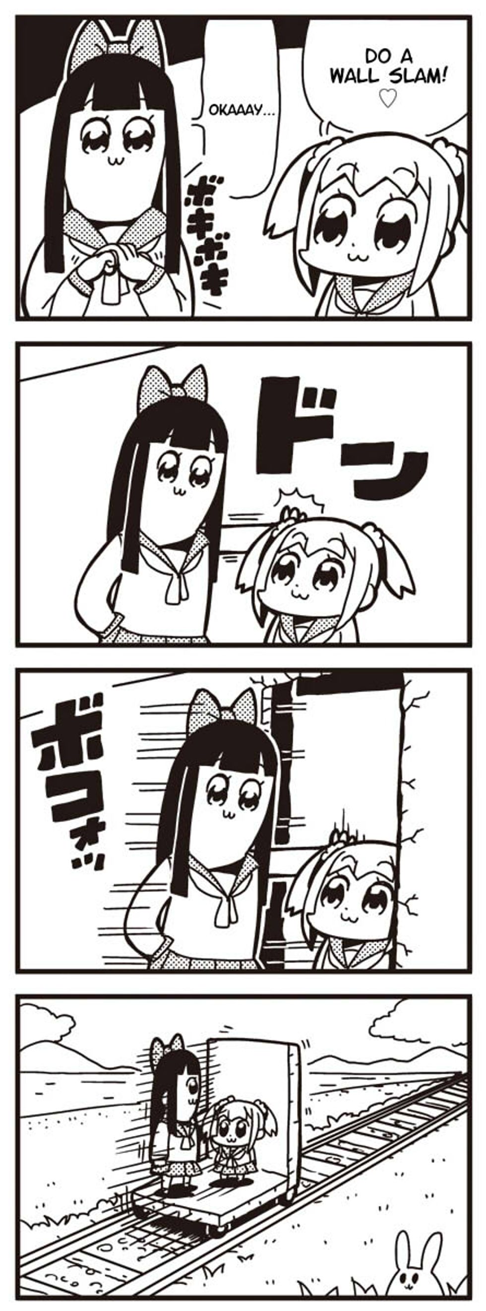 Poptepic is a webcomic series featuring the disjointed, insane hijinks of the short orange-haired spitfire Popuko and the relatively calm blue-haired Pipimi. Those two constantly-smiling girls are just about the only recurring characters in the series, which has absolutely no continuity whatsoever. Instead it favors dada-esque randomness and a surprising amount of vulgarity for how cute it usually looks.