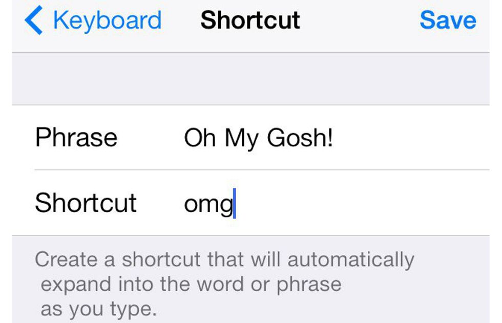 Say there's a certain word or phrase that you use a lot. You can create a shortcut for it so every time you type that shortcut, the whole word or phrase will automatically appear. Go to Settings - General - Keyboard - Text Replacement.