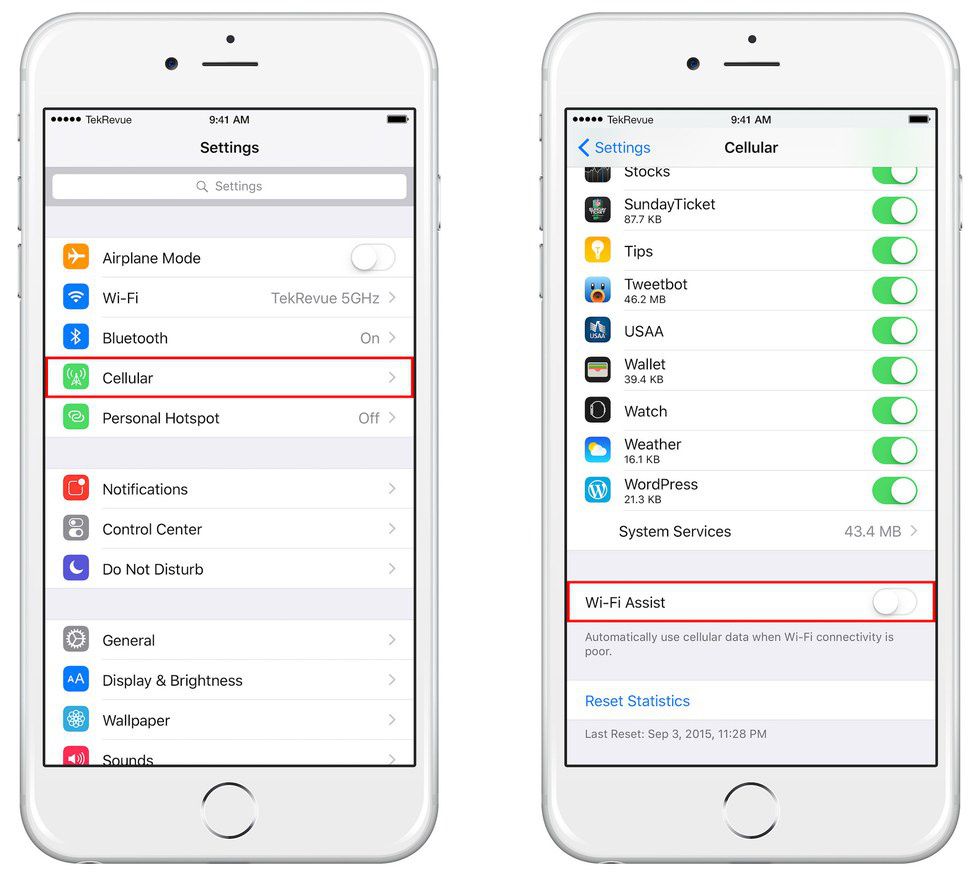 Wi-Fi Assist is a feature that was added in iOS 9 that is intended to make Internet use more consistent. When you’re on a Wi-Fi network that has a bad connection, Wi-Fi Assist uses the cellular network data instead. To turn this off to help save data, go to Settings and then click Cellular, and scroll to the bottom of the page to find Wi-Fi Assist, and tap it off.