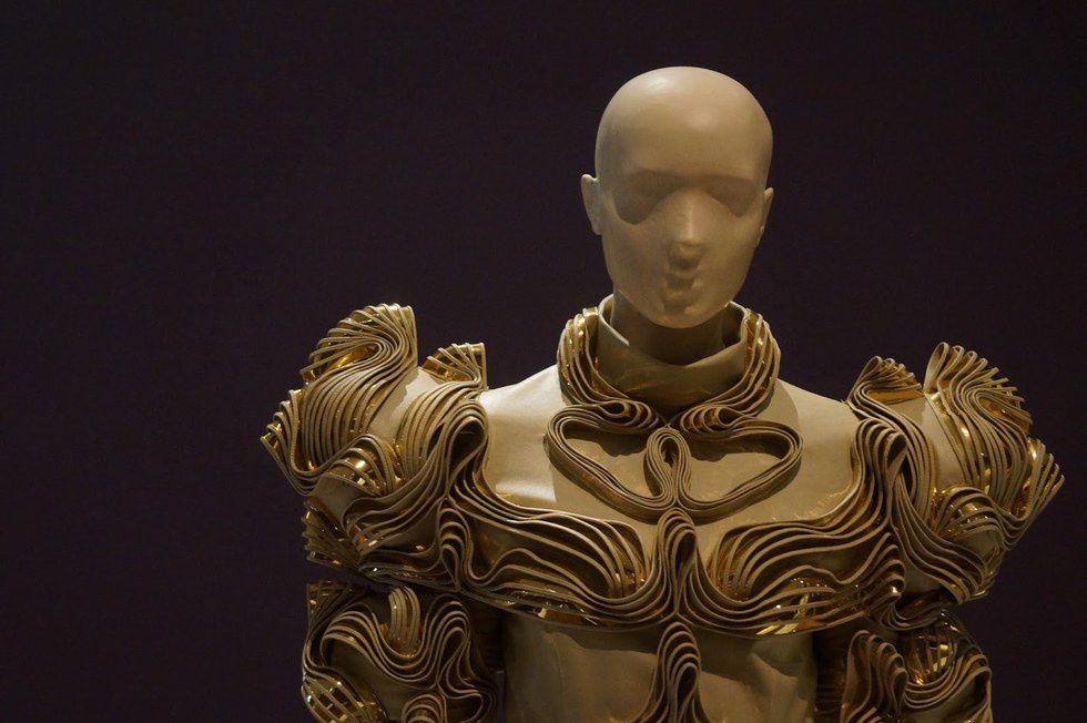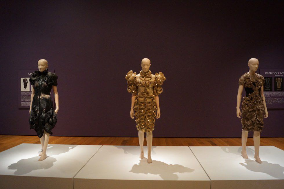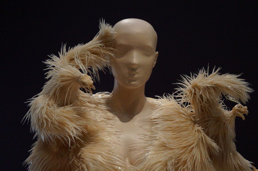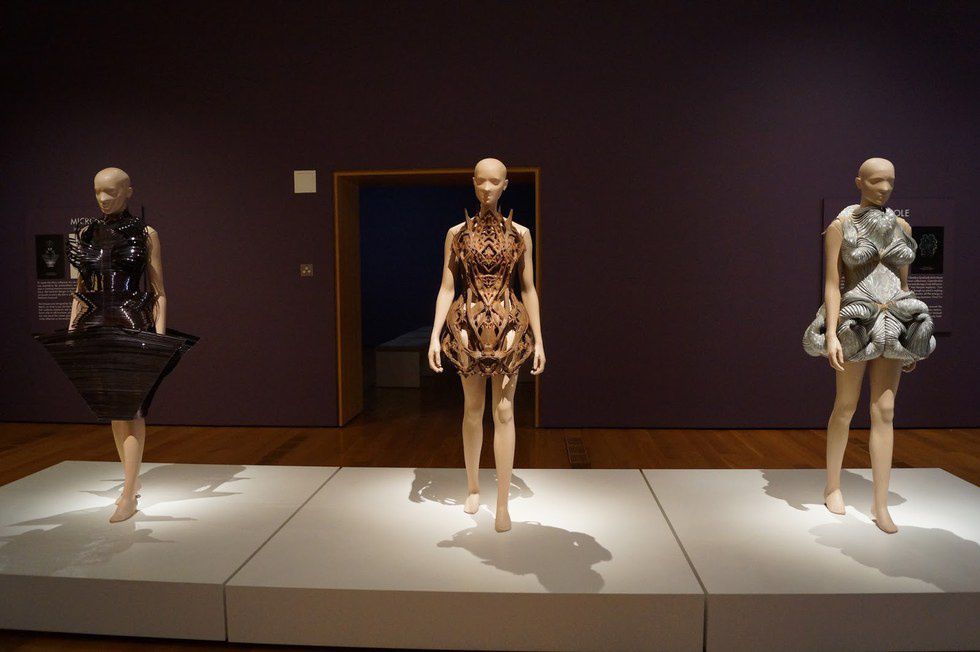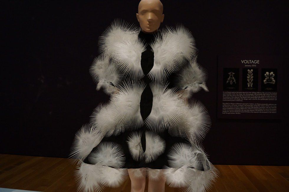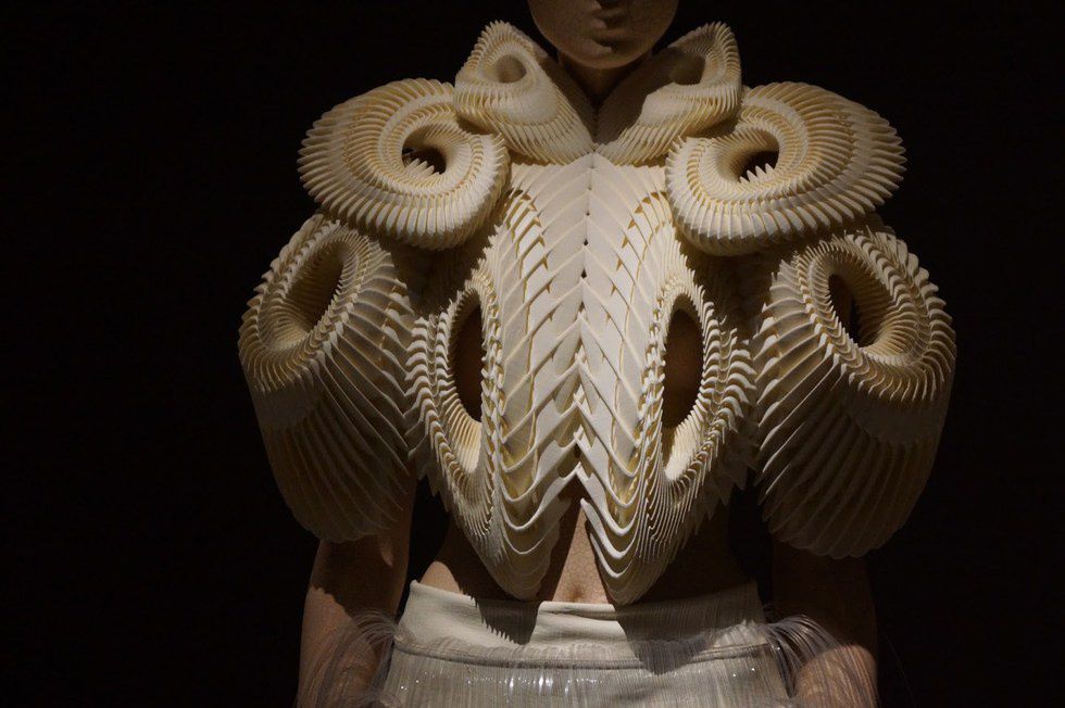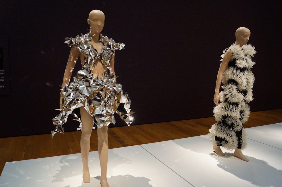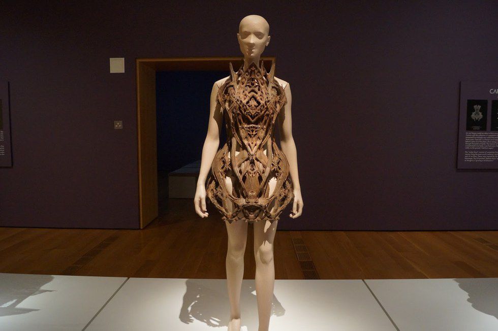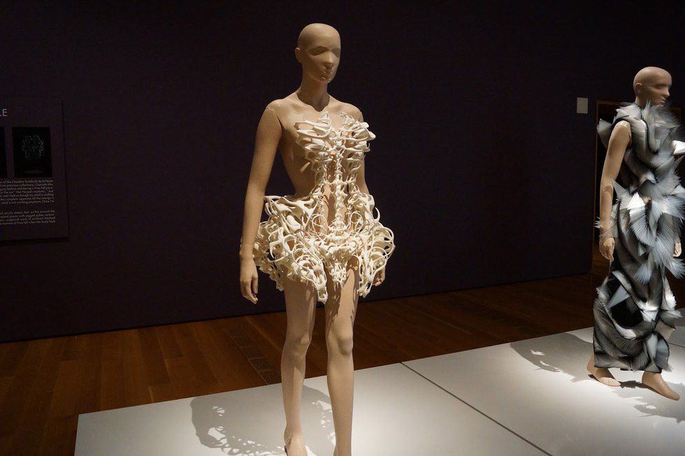 Last year, forward-thinking designer Iris Van Herpen had an exhibition: Iris Van Herpen: Transforming Fashion that included a 3-D printed skeleton dress that was meant to evoke "the moment of free fall when the body feels as though it is growing in all directions" and a handmade dress made from PET, a material commonly used to make plastic bottles, with hot air guns and metal pliers from her Crystallization Collection.