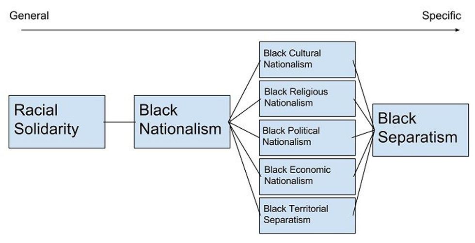 The graphic below, provided by Wikipedia, illustrates how the noble goals of black nationalism can quickly turn separatist as a means achieving community empowerment.
