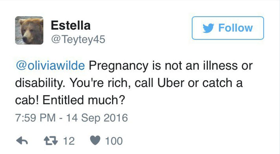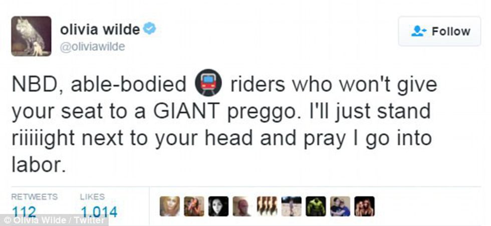 Last Wednesday pregnant actress, Olivia Wilde, wrote a Twitter post scolding New York City subway riders because they refused to give up their seats. "NBD, able-bodied riders who won't give up your seat to a GIANT preggo, I'll just stand riiiiight next to your head and pray I go into labor," she tweeted.