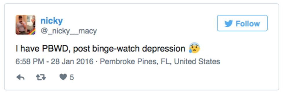 Think about how you felt while catching up on your favorite show. When an episode ends you just can't help but watch another and it feels so good to know you don't have to wait another week for a new episode to be released because you have 3 full seasons at the click of a button. But what about when you actually have to resume to your responsibilities or when you're all caught up on episodes or even worse, when your favorite show comes to an end? Many people have reported feelings of "PBWD," or "Post Binge-Watch Depression," a term invented by Netflix users to explain their sadness after a binge-watching session. Many fellow binge-watchers also say things like "I don't know what to do with my life now" and "I haven't socialized in weeks" once they watch the final season finale of their favorite shows. Let me tell you, it's not easy going back into the "real world" after a long time Netflix leave.