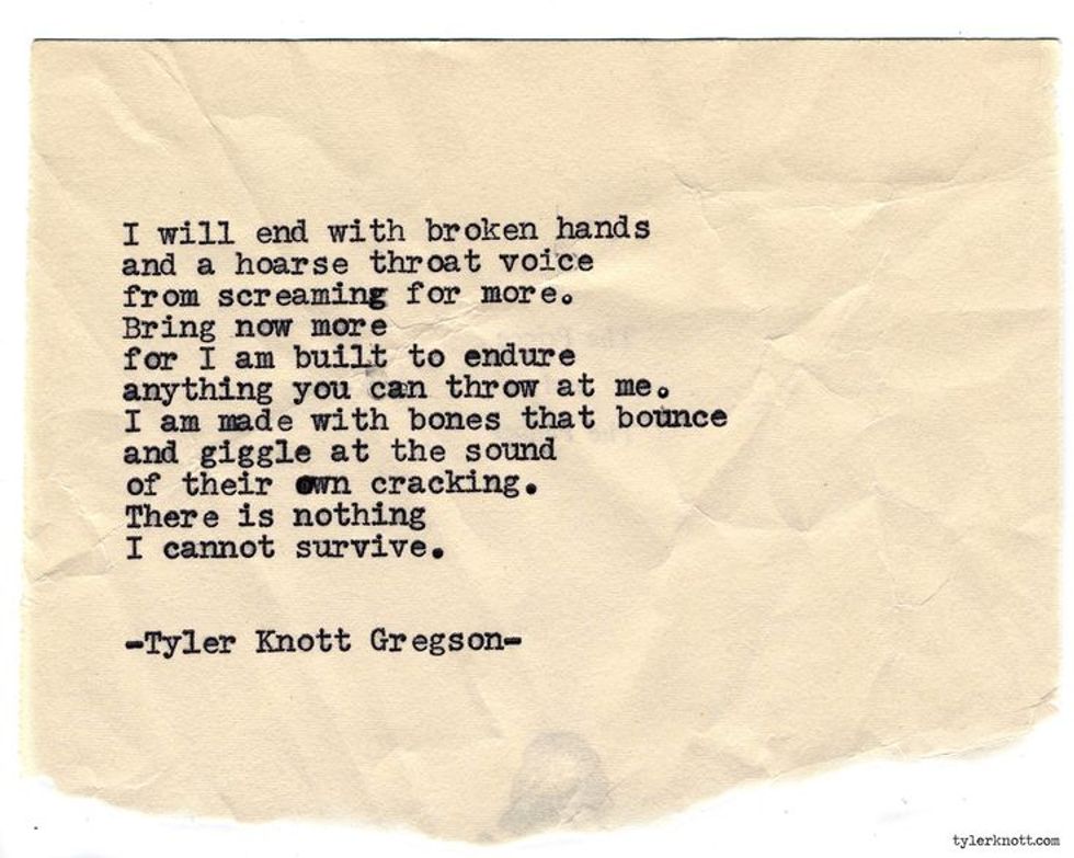 Also, despite all the dismal statistics, there are people today fighting to keep poetry alive. Tyler Knott Gregson is a wonderful poet who has recently published two books of verse and regularly posts haikus and poems online. Rattle is an online publication that is striving to “promote the practice of poetry.” They accept poetry from anyone and award annual prizes to the best submissions.