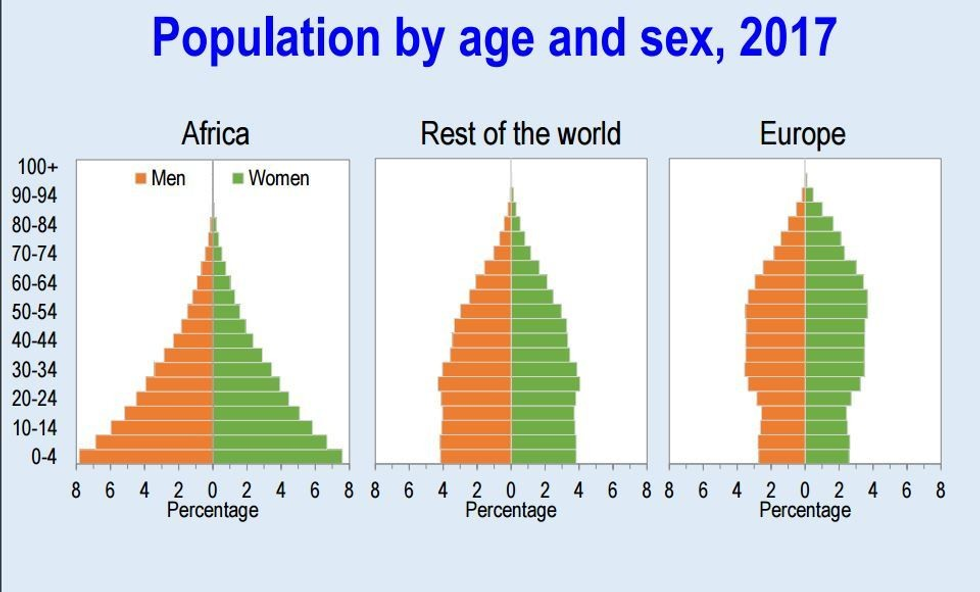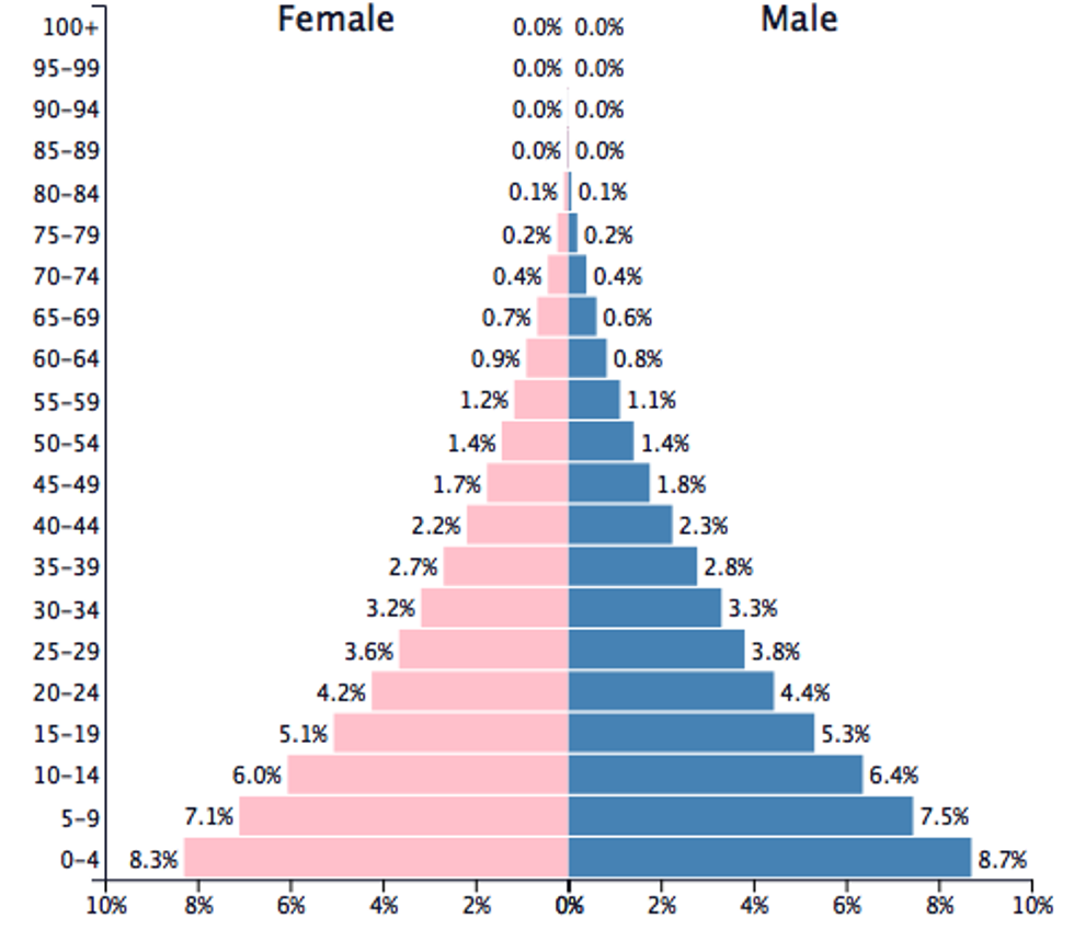 The countries with the most exponential growth are developing nations, and this is due to age. When a majority of the population is young, reproduction rates will continue to grow faster. Just compare the graphs below.