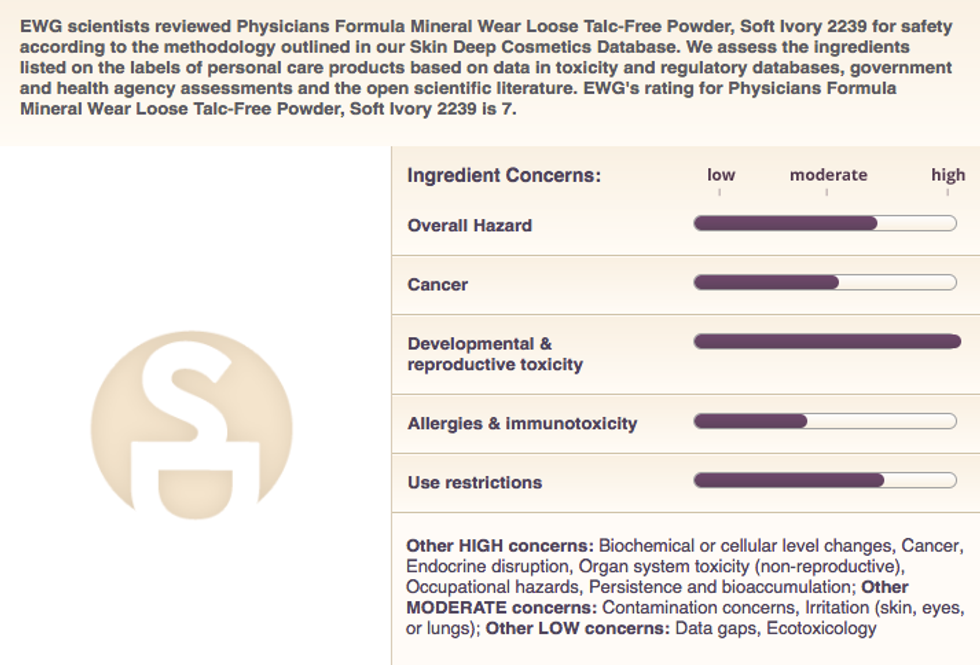 Using the Environmental Working Group's (EWG) Skin Deep database, I realized that my mineral powder was certainly not as safe as I had thought. In fact, almost all of my cosmetic products contained at least one product that could cause adverse health effects overtime.
