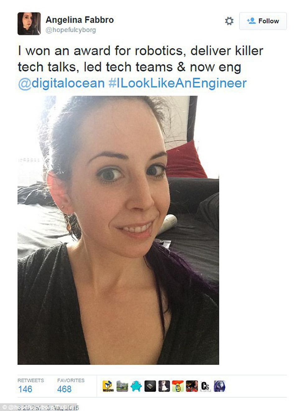In attempt to eliminate sub-conscious bias when it comes to diversity, Isis started a movement. She invited people in her field globally to join in on the non gender specific hashtag, “iLookLikeAnEngineer.” Her goal is to redefine the stereotype of what an engineer, or other people in a technical field are “supposed” to look like. Engineers across the world have contributed to this campaign by tweeting photos of themselves with the hashtag “iLookLikeAnEngineer.”