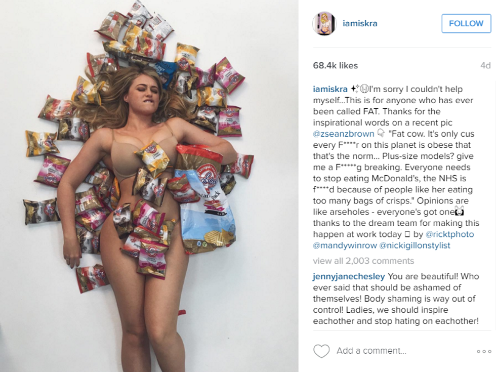 Photoshop and software are regularly used to improve the way in which someone appears. Iskra Lawrence took a stand and posted a picture of herself with junk food. She is hoping to show that a woman can still be beautiful even if they don't fit the ideals that have been created by society. Being a plus size model shouldn't be seen in a negative way because beautiful comes in all shapes and sizes.
