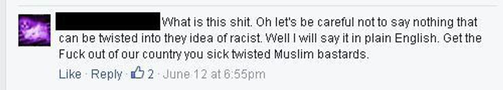 I am fully aware that Mateen has made several claims that directly link him to radical terrorist groups. I am not defending his actions nor am I defending the hate groups whom he allegedly pledged allegiance to. But the image below is a real comment that I found on my friend's Facebook page in the days following the shooting: