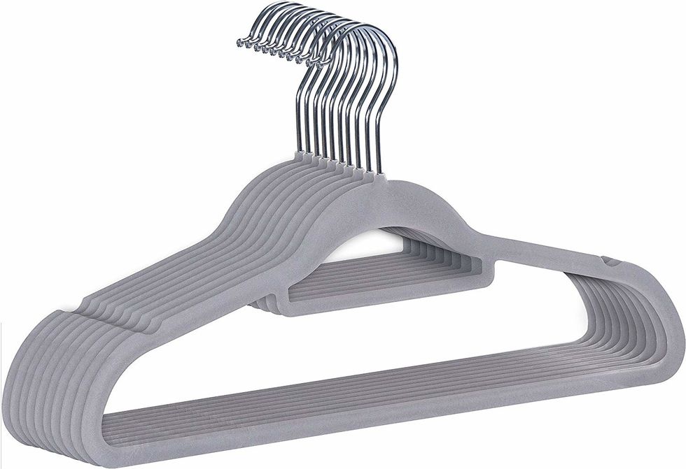 This is one thing that my mom suggested, and I am so glad she did. It may seem like a small change but felt hangers truly make a huge difference in closet space. I have most of my winter clothes and some summer dresses all in one closet thanks to these hangers.