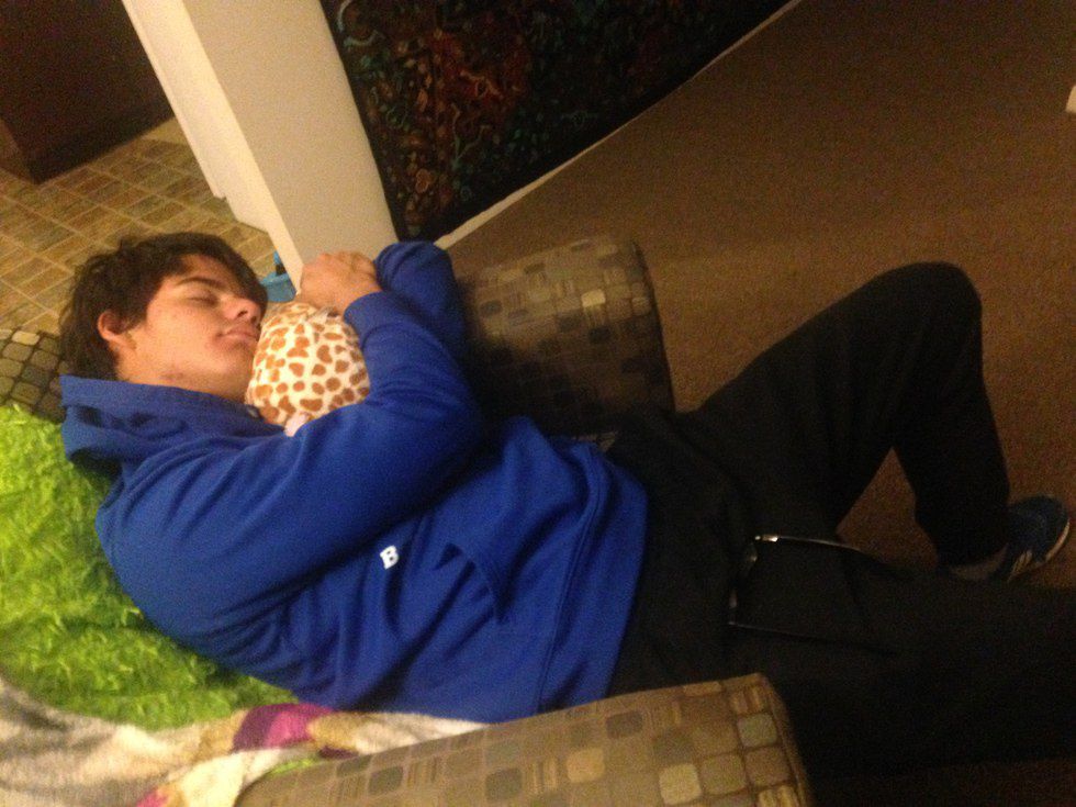 (This is a picture of himnapping with my stuffed giraffe, Willy.) Every time Luis comes to my place he falls asleep with this giraffe for at least twenty minutes and then wakes up and won't stop talking. Although it is annoying, I wouldn't trade his sleepy banter for anything.