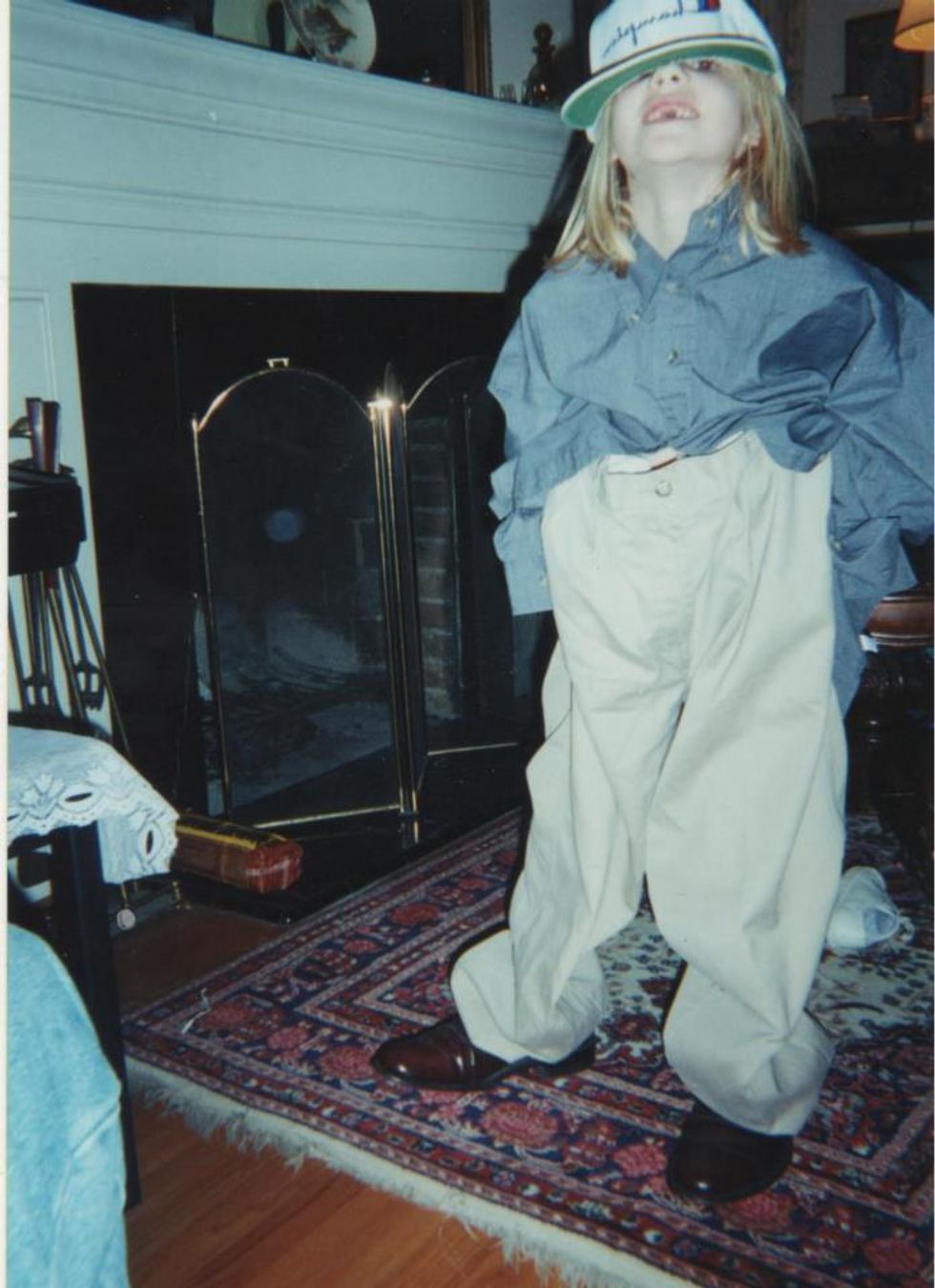 Above is a fantastic representation of the relationship I have with my cousins. We would always be thinking up some play to act out that our parents would be forced to endure. I am, obviously, the fierce one wielding a sword and sporting a vintage vest from the eighties. I often would pillage my brother’s closet for sweet new duds because I thought his clothes were the coolest. I actually have a picture of me in all of his skater gear, but before he took the picture, he recommended for me to throw up a gang sign. I probably shouldn’t put that on the Internet. I do, however, have one of me in all of my dad’s clothes.