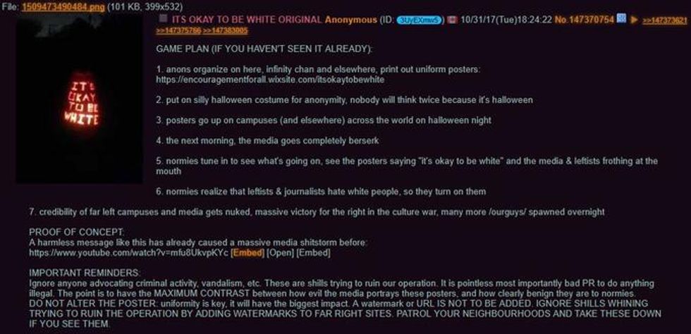 The signs were originally started by a 4chan user. The signs were supposed to expose the media and left-leaning people for apparently hating white people. They were intended to cause “lefties” to become enraged and lose their credibility politically, which would ensure the right a “massive victory in the culture war,” according to the anonymous user.