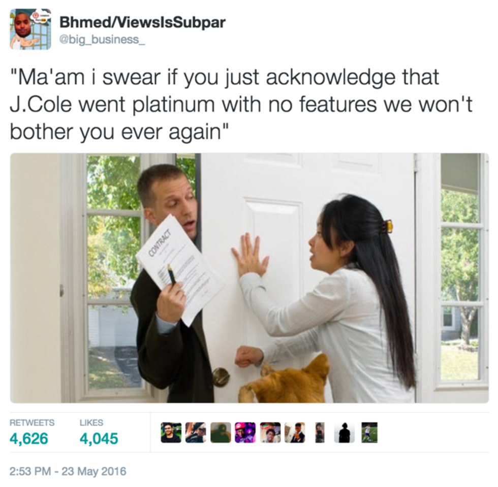 J. Cole fans were finally blessed with new music this past Thursday night when Cole dropped his highly anticipated LP, 4 Your Eyez Only. Fans have been (im)patiently waiting for new music from the rapper since the release of 2014 Forest Hills Drive, Cole's third studio album which was highly successful and even went double platinum without any features—sparking a meme sensation that took over social media for pretty much all of 2015.