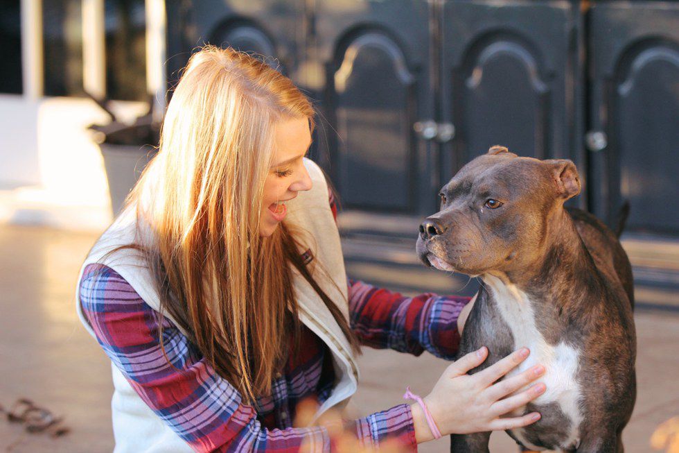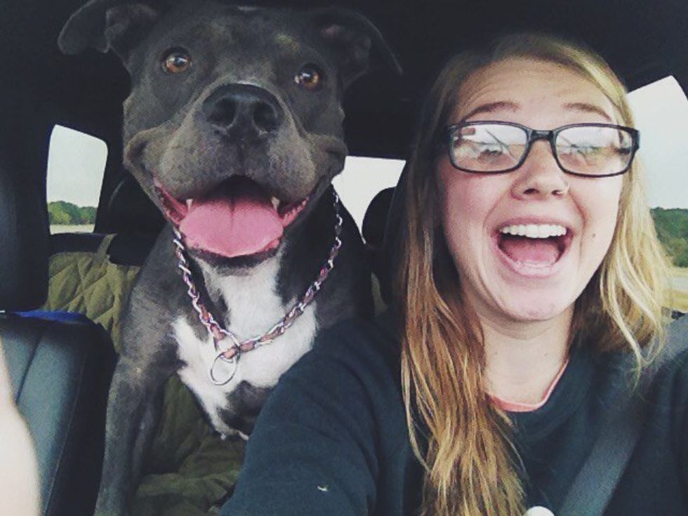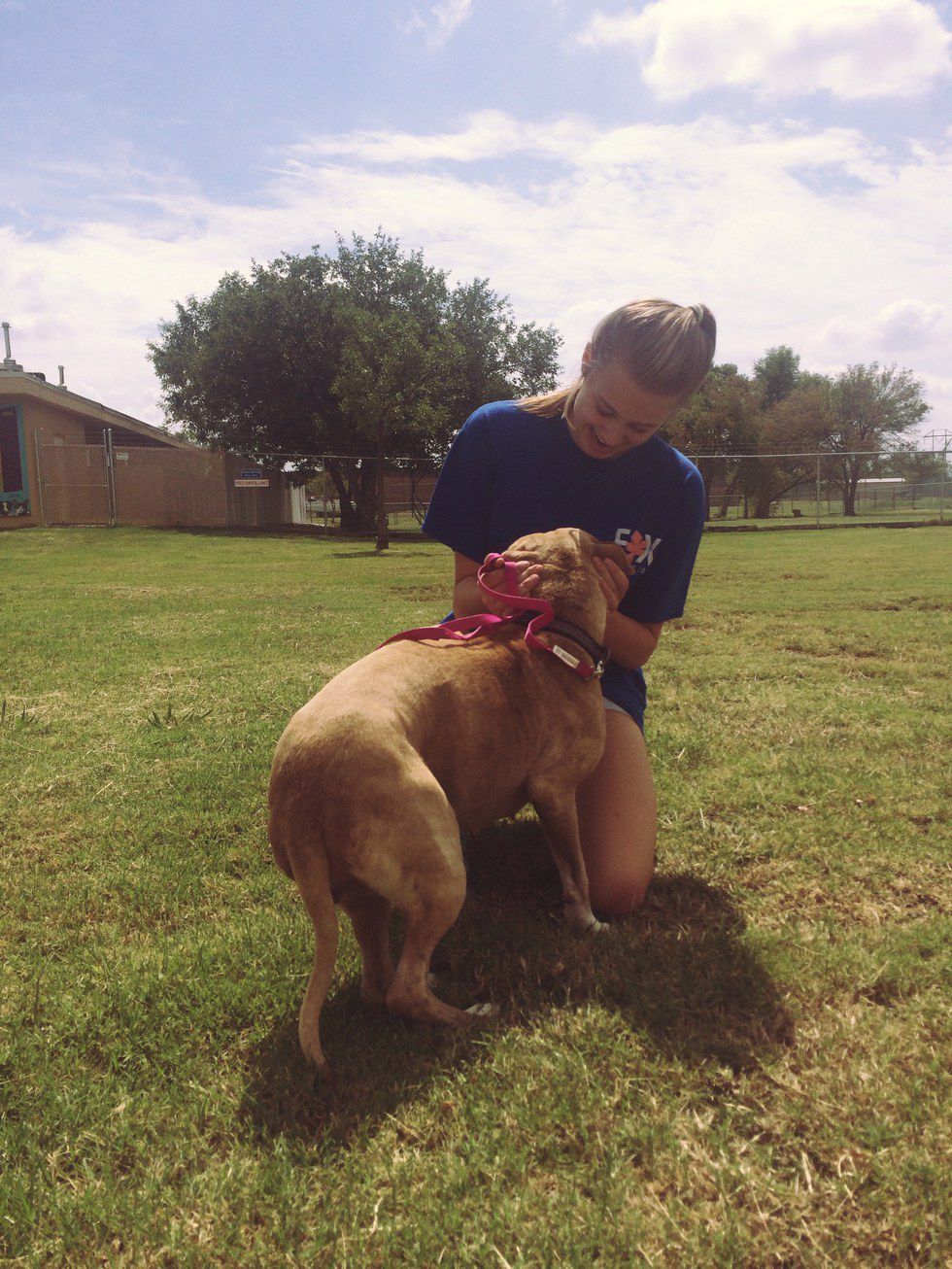 Tess is ferociously kind. She barks when she's hungry and has adopted my best friend's dog as her little sister. Tess has never bitten, acted aggressively, or attacked anything or anyone. She has alopecia, so she's balding around her middle and we put sweaters on her in the winter so she doesn't get cold. She snuggles up to me at night and watches me until I fall asleep, and then she doesn't move until I wake up. She eats leaves from the branches of trees at the dog park and looks like a baby hippo when she swims in the water. She is a trained service dog, and lays on top of me when I have panic attacks. She loves popcorn and peanut butter and takes allergy medicine when the seasons change. When I was hospitalized and in the ICU for three days, she hugged me when I came home. She is the opposite of every stereotype of pit bull I've ever heard.