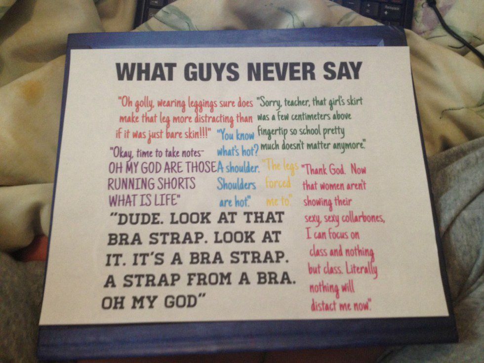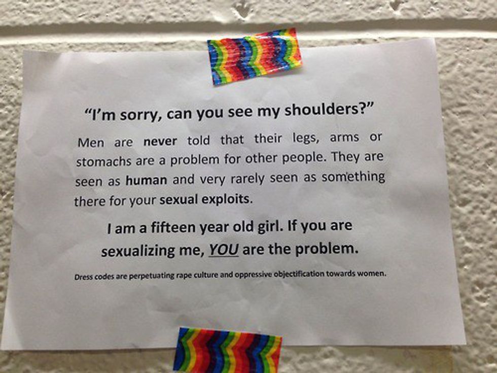 Almost 60 percent of schools enforce a strict dress code around the country, according to the latest findings from the National Center for Education Statistics based in Washington, D.C. Requirements, however, vary from school to school. Most of these dress codes have double the standards for girls that they do for boys. How often do we police the body of a young girl? How often do we hear parents whispering to each other in the schoolyard about the kid who has a skirt on too short for their liking, a tank top on that God forbid shows their shoulders, or even has her hair in a certain way that would cause people to say that "she is asking for it"? Also, how often have you been the perpetrator of these comments?