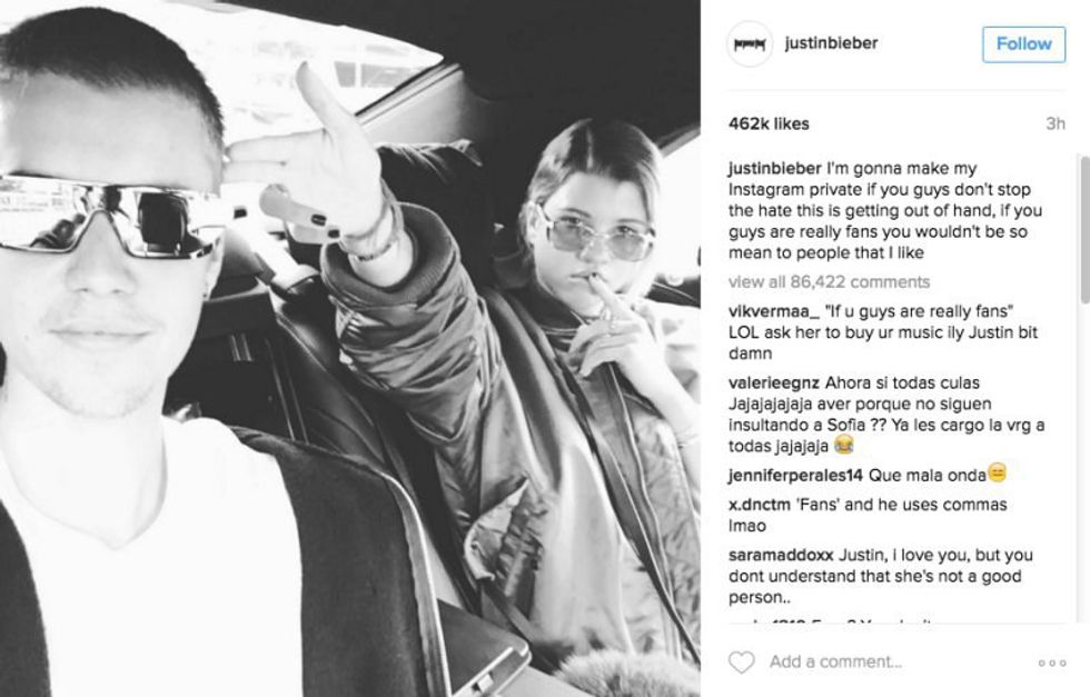 Quickly becoming frustrated with his fans, Bieber edits the caption on a photo of the two in order to send a message to his fans: “I’m gonna make my Instagram private if you guys don’t stop the hate this is getting out of hand, if you guys are really fans you wouldn’t be so mean to people that I like.”