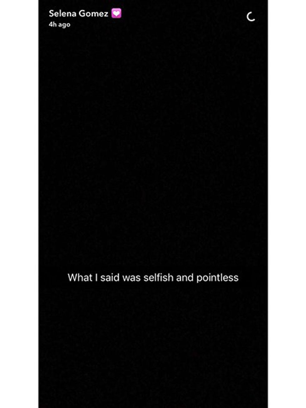 Selena writes on Snapchat “What I said was selfish and pointless.”