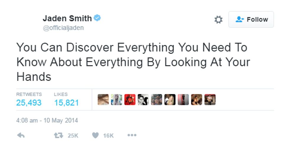 Then look no further than Jaden Smith's twitter account. Jaden Smith, the greatest philosopher of our time, offers free bits of wisdom on twitter. Here are some of the greatest of his nuggets of wisdom: