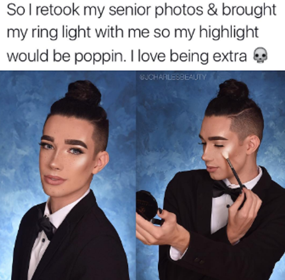 James Charles has become famous on Instagram for his amazing makeup looks. He currently has over 673 thousand followers. Most recently, his picture of him reapplying his highlighter before retaking his senior pictures has been circling the internet. He's gotten thousands of comments on Twitter, Instagram and his recently made YouTube.