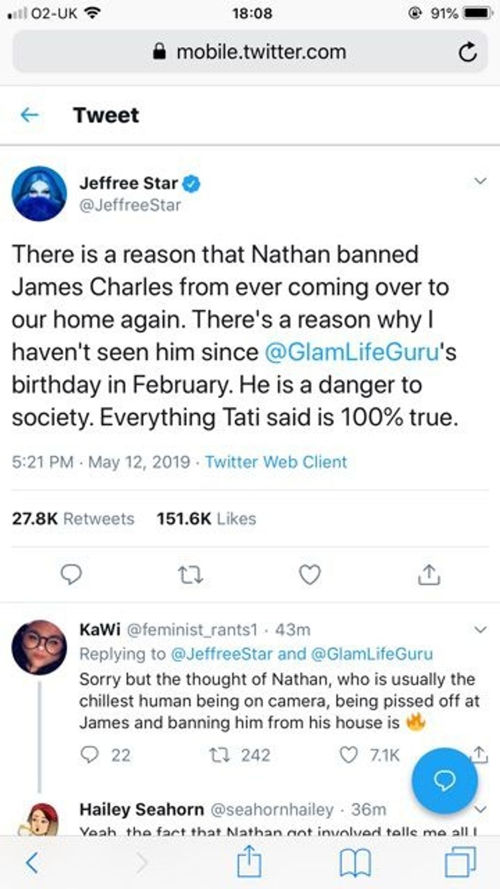 Jeffree Star broke his silence too with 2 tweets. In the first tweet, JStar hints that James came onto Jeffree's boyfriend Nathan and makes an extremely serious accusation against him. Jeffree Star has since deleted the tweet.