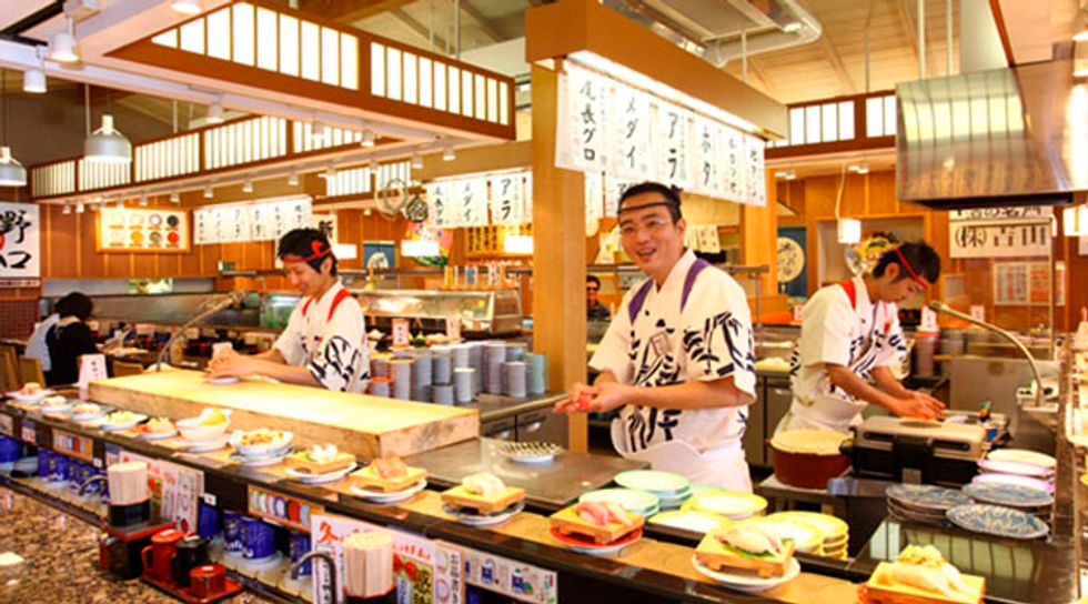 It's sushi that gets delivered to your seat via conveyor belt. What's not to love about that?