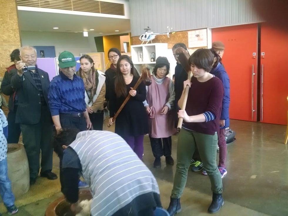 After our first new year's meal, it's time for mochi. Mochi is a sticky rice cake that is frequently made and eaten on special occasions. (It is a common belief in Japan that, rather than a man in the moon, there are rabbits on the moon, always working hard to make mochi!) We use store bought mochi and also make our own from special mochi rice. Once the mochi is cooked/heated up, we flavor it with different things. We have a sweet mochi we make using kinako, or roasted soybean flour. We also use soy sauce and seaweed to make savory mochi, and also we can finely grate daikon radish to make a spicy dip for the mochi cakes.
