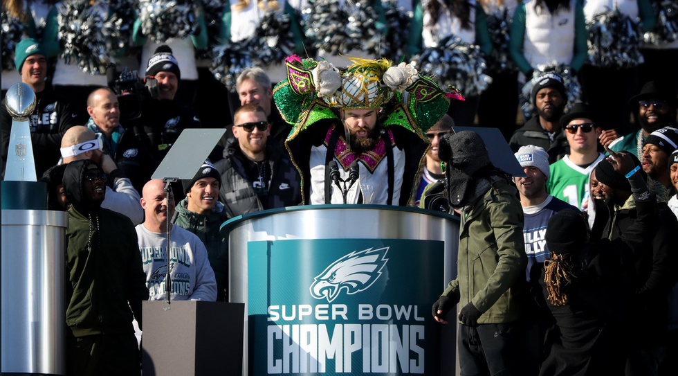Jason Kelce deserves the title of “Super Bowl Championship Parade MVP” after his show in Philadelphia on Thursday. Not only did this man show up dressed in his mummers best, ditch the bus to walk alongside fans, crowd-surf on the streets, lead an iconic (and uncensored) Philadelphian anthem on live TV, chug (multiple) beers along the parade route, and ride a “borrowed” police bike. Jason Kelce then continued to deliver what could arguably go down as the most epic speech in Philadelphia sports history. (Sorry, Chase Utley.)