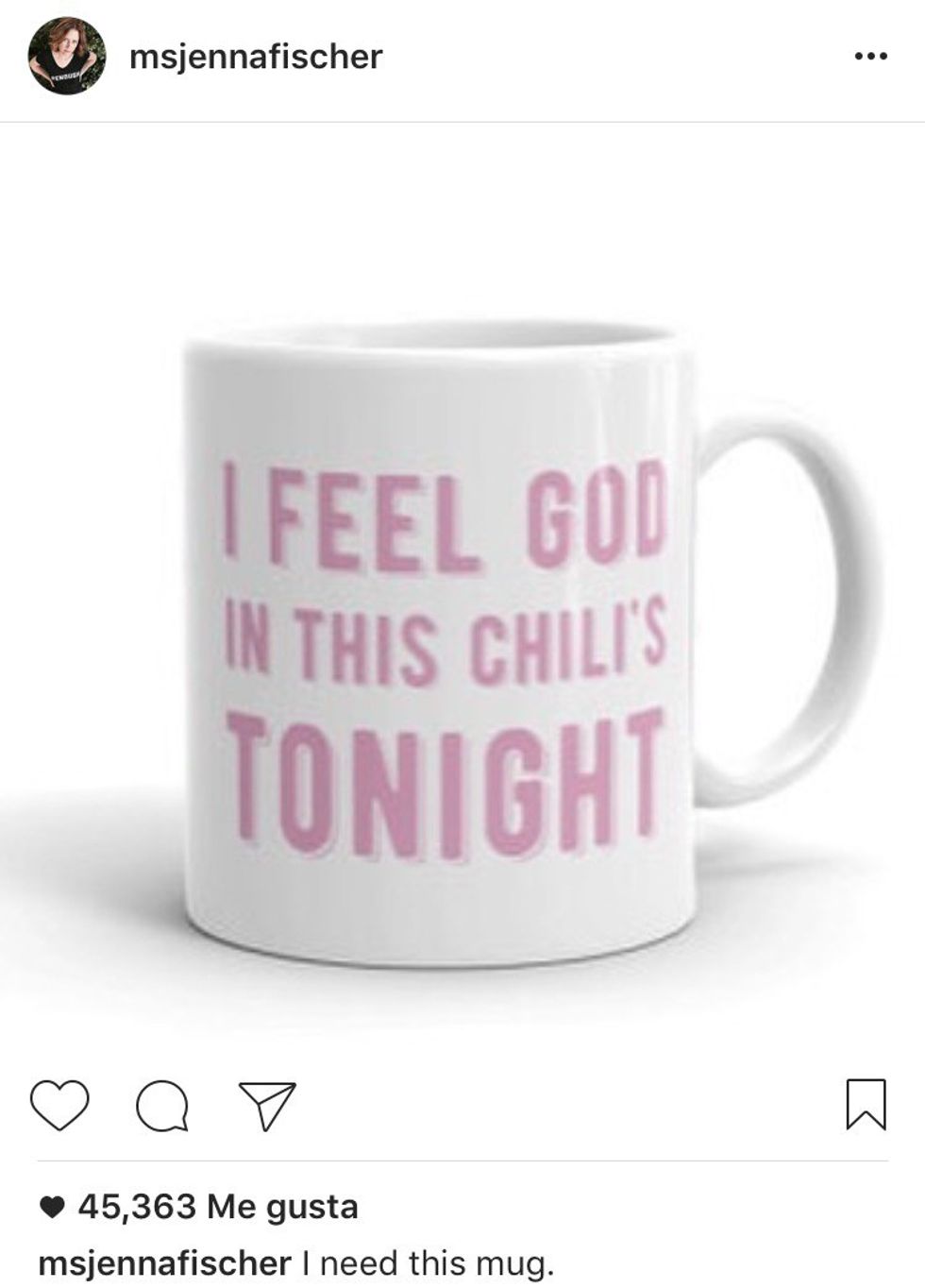 Fisher took to Instagram again to share a product shot of a mug that said “I feel God in this Chili’s tonight," one of Pam’s (Fisher’s character on the show) most iconic lines from the whole series. Pam drunkenly exclaimed this quote in her acceptance speech of her Dundie, a fan-favorite moment from the show.
