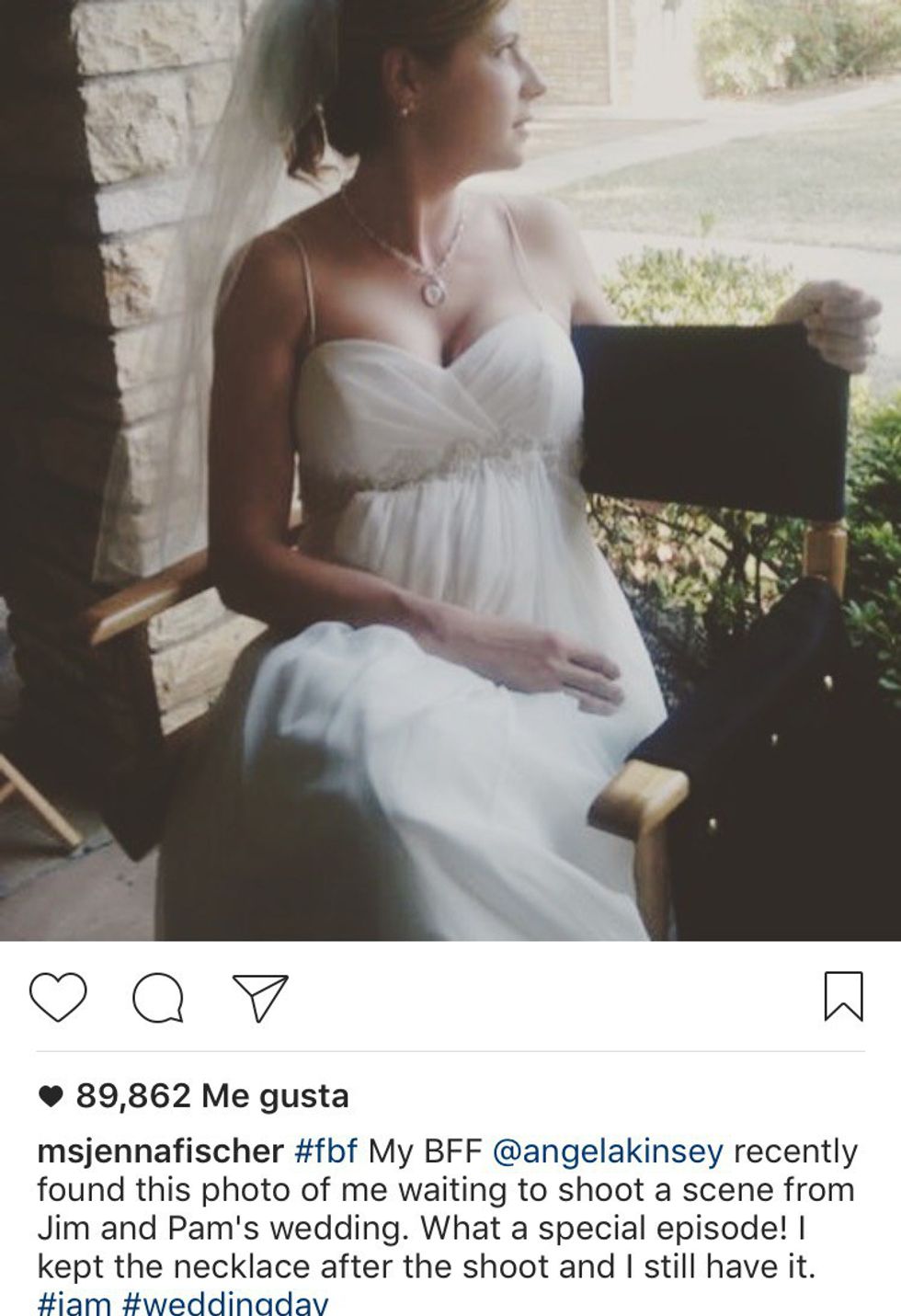 Jenna’s next post really tugged on the heartstrings of fans of Jam (Jim and Pam’s relationship). Fisher posted a photo of her in her wedding dress, sitting on the set of Pam and Jim’s wedding in between scenes. Her costar Angela Kinsey snapped the photo, which is now a sentimental keepsake of Fisher’s. She said in the caption, “What a special episode! I kept the necklace after the shoot and I still have it.”