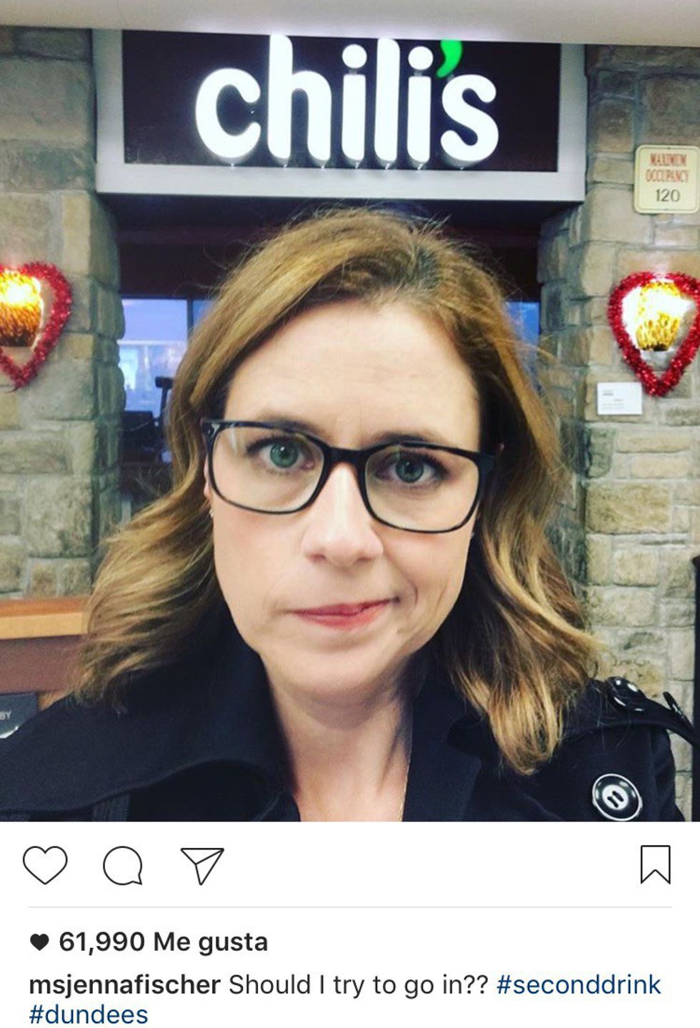 Finally, Jenna Fisher made a hilarious nod to the time Pam got banned from Chili’s after her drunken Dundies acceptance speech. She posed for a selfie outside of the popular chain with a sheepish face, and captioned it “Should I try to go in?” She also referenced one of her best lines from that episode with the hashtag #seconddrink, which refers to when she told Jim that when the ice melts in a drink and the water level rises its like a "second drink."