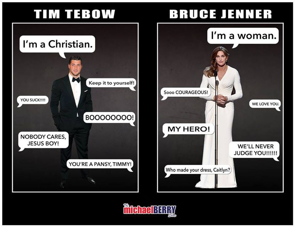 In a June interview on "The Dan Patrick Show," sportscaster Bob Costas maintained that Jenner's award was not won "because of the validity, but because of whatever the kind of gawker factor is." The main backlash, however, came not from the more moderate comments by pundits such as Costas, but from social media, where spiteful images such as these caught acclaim from self-imposed warriors for morality: