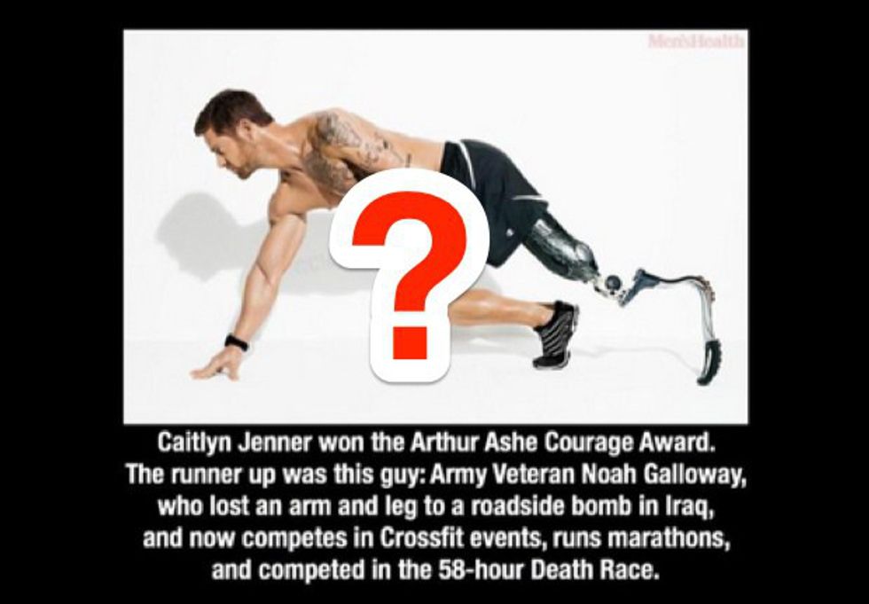 Jenner's award, which honors sports figures who portray tremendous courage inside or out of the sports world, was met with widespread indignation across social media and conservative news broadcasters. According to a false rumor originally started by Gerry Callahan, a writer for the Boston Herald, Jenner beat Noah Galloway, a double amputee veteran of the Iraq War, and Lauren Hill, the late basketball player at Mount Saint Joseph's who suffered from inoperable brain cancer during her time on the team, in a race for the award.