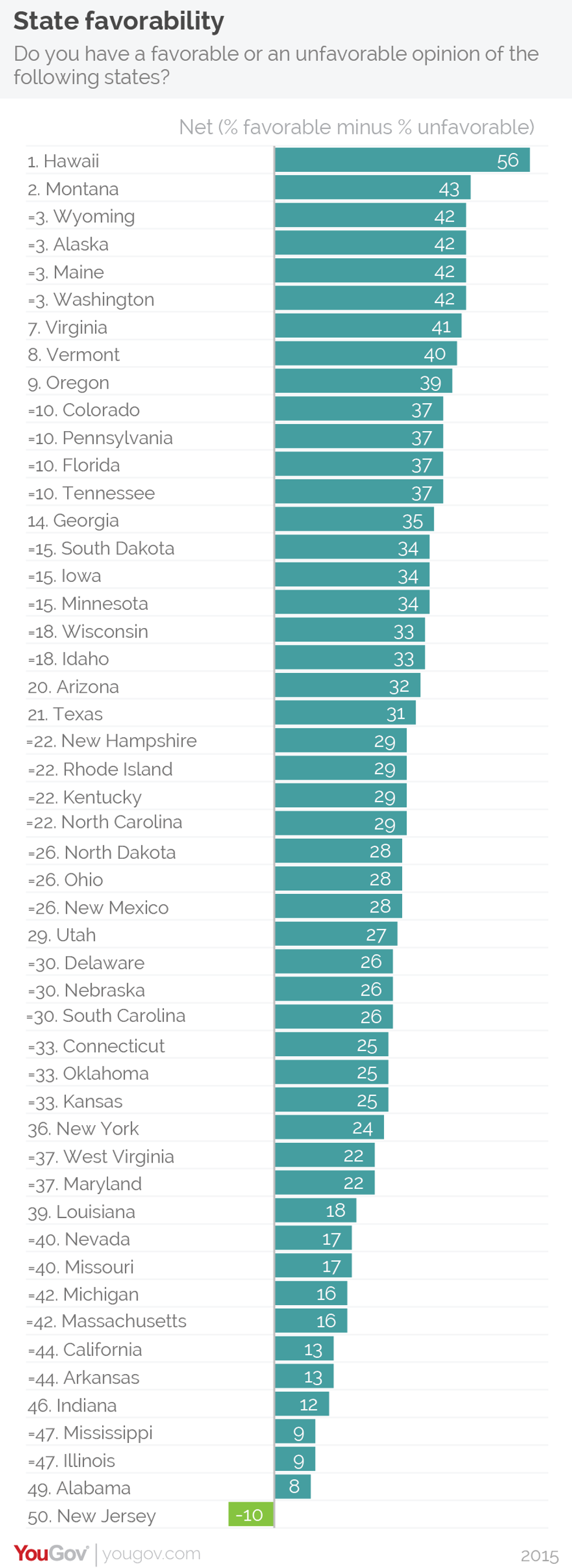 New Jersey: also known as The Garden State, the Turnpike capitol of the world, or that place where Snooki hangs out. Beloved by its citizens for everything except its property taxes, Jersey Pride is a strong sentiment for many of us who grew up in the most densely populated state in the Union. However, the rest of America places NJ at the top of an entirely different list. According to a recent YouGov poll, our beloved home is ranked the most disliked state in the country. The public's opinion is so low, in fact, that Jersey is the only out of all 50 that a majority of people have negative opinion of.