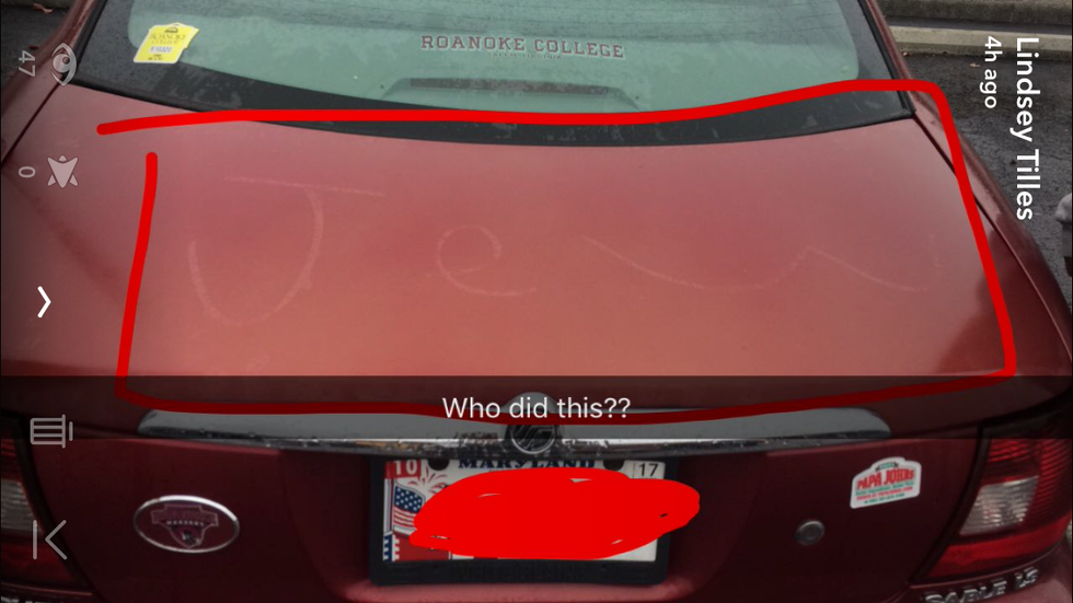 Back to my car, though. I had posted a picture of it on Snapchat asking who had done it, but instead of getting an answer I had people telling me it made them angry, and that I should be worried. So, I started getting worried. I started posting on social media asking for whomever had done it to let me know so I wouldn't have to advise the college faculty that there could possibly be some bigotry on campus. No one responded. I realized that it was possible that someone was targeting me, so out of concern for my own safety I notified the campus police.