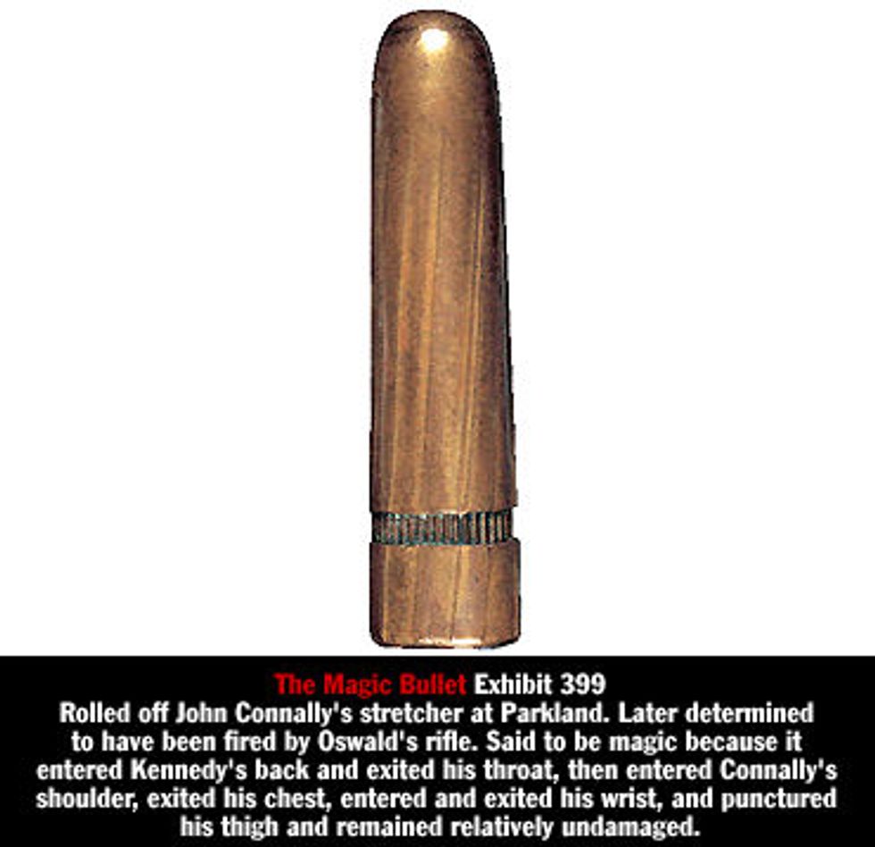 This bullet supposedly passed through Kennedy's torso, through Connally's torso, passing through Connally's wrist, and finally ending up in Connally's thigh. This theory is thought to have been created to fit the Warren Commissions idea that Lee Harvey Oswald was a single shooter firing only three shots. Only three shells were found on the sixth floor of the Texas School Book Depository. One bullet caused six wounds and yet was remarkably found intact. One bullet hit James Tague. One bullet caused Kennedy's fatal head wound. The U.S Army did a re-enactment and found the bullet to have suffered substantial damage. The bullet changes course and is too undamaged to have possibly caused all of those wounds.