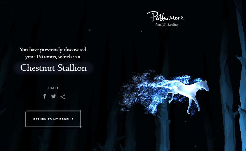 Pottermore has hooked us in once more, blurring the lines between reality and fantasy by allowing us to find out what our Patronus Charm would be. If you haven't already done so, check it out here! I must admit, I'm pretty excited about my Patronus, it's a Chestnut Stallion.