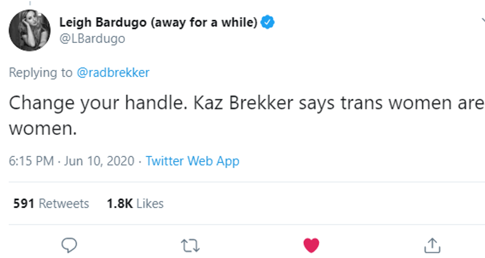 In her replies, she received some criticism from her followers. After trying to engage in a thoughtful and civil conversation, someone replied with something blatantly transphobic. This user happened to have the name of one of Bardugo's main characters, Kaz Brekker in their username. Bardgugo replied, saying:
