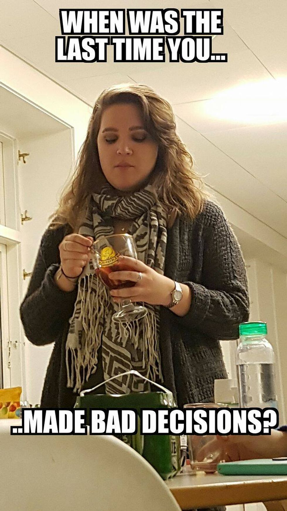 1. The first night we were all going to go out I walked into the kitchen and screamed, "I am ready to make bad decisions!" A sentence that Jo would haunt me with for the rest of the semester, and though I did not follow through with that statement, this was the meme of the night made by Jo: