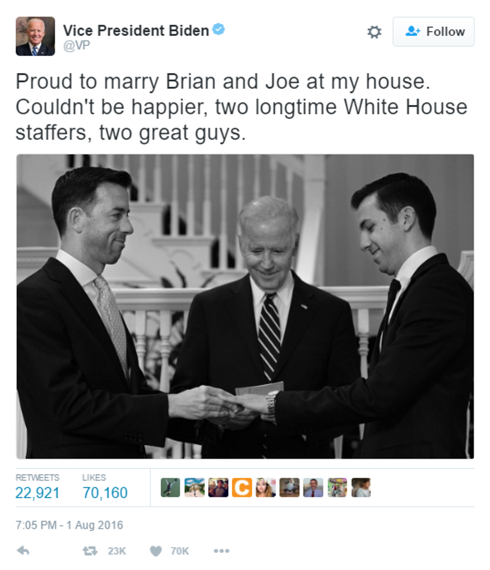 Brian Mosteller, the director of Oval Office operations, and Joe Mashie, a trip coordinator for Michelle Obama, tied the knot on August 1st, in a small ceremony in the vice presidential residence at the U.S. Naval Observatory in Washington, D.C.