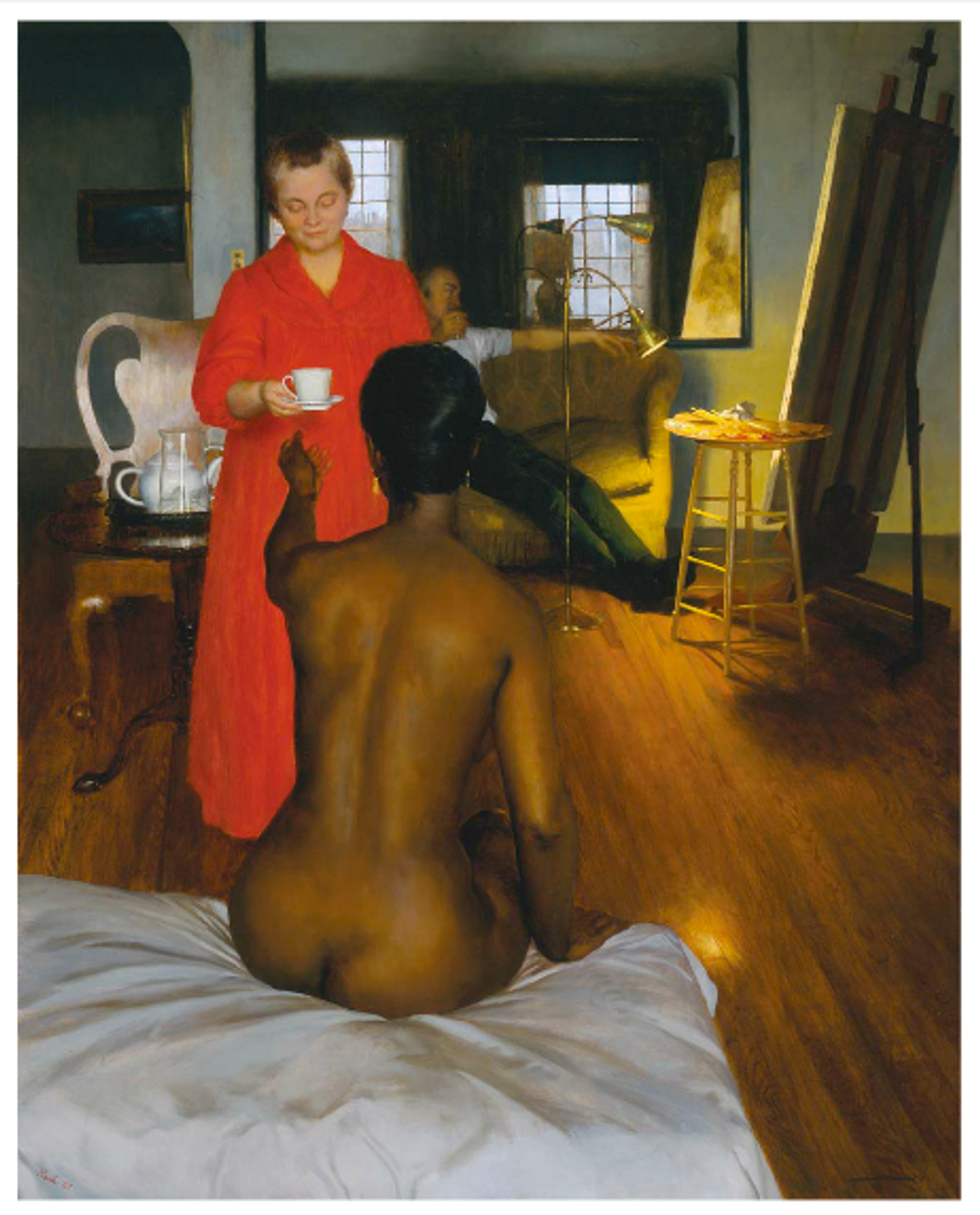 I enter the Memorial Art Gallery, lost in search of the two paintings for my class assignment. The receptionist presents me with a map and pinpoints the exact locations of the two works with red ink. I venture into the halls of the gallery, scouring the walls, looking for what the woman described, as well as trying to recall my prior knowledge of the images. I find both, but I find myself unfathomably astruck by John Koch’s Interlude, and thus, I return to his painting. Crouching beneath the frame, I type the tombstone into a new Word document, my calves burning. I scan the masterpiece up close, looking carefully at both the brush strokes and a discernable technique in painting and in blending of the colors. My focus is drawn to the woman of color at the forefront of the work, her nude body so delicately painted. Every shade of her skin, every muscle in her back, and every curve of her body is given great attention by the painter. Other museum-goers pass by me, and I inch my way back into the adjacent gallery to place myself on a couch parallel to the painting. This is a full front-on view, but from afar. From here, I can see the white bed sheets that caress the black woman’s posterior. Her body is eloquently painted with a lighting technique that emphasizes the strength in her physical structure. The vibrancy of the older white woman’s red robe captures my attention and juxtaposes the natural colors present in the rest of the painting. Lighting in the background is strategically placed in order to highlight the easel, as well as the canvas in progress. Koch is skillful in his composition, technique, and overall meaning, the last of which I will be discuss in more depth below.