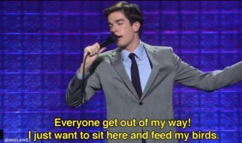 You get home from finals; mentally, physically, and emotionally exhausted. You don't want to talk to anyone. You just want to plop down on the couch. Just like this quote, except replace "my birds" with "myself." Because you just need some sustenance. Let's be real, you haven't had a full meal or even seen a vegetable since November.