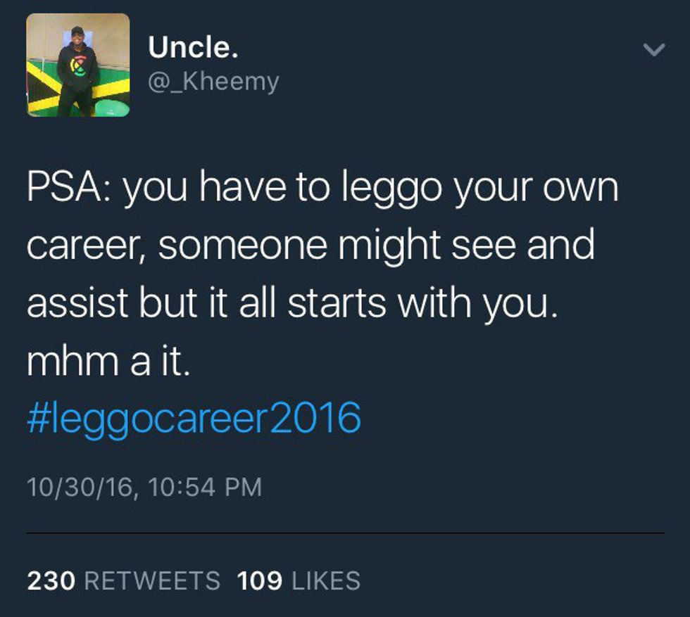 As a proud Jamaican, living in a foreign country, I saw it fit to use my voice and resources to share the movement to my online audience. This is more than just a hashtag, it is a way of actively engaging our youth in constructive and empowering discussions both "ah yaad and abroad". We are in fact our brother's keeper and our job is to inspire and uplift. The progress of our youth should not be left to life chances as there are a plethora of opportunities out there waiting for us. What we need to do is wake up and realize that if we don't take the first step in progress, there's no way we can reap success, and that is what the #LeggoCareer2016 movement wants us to do.