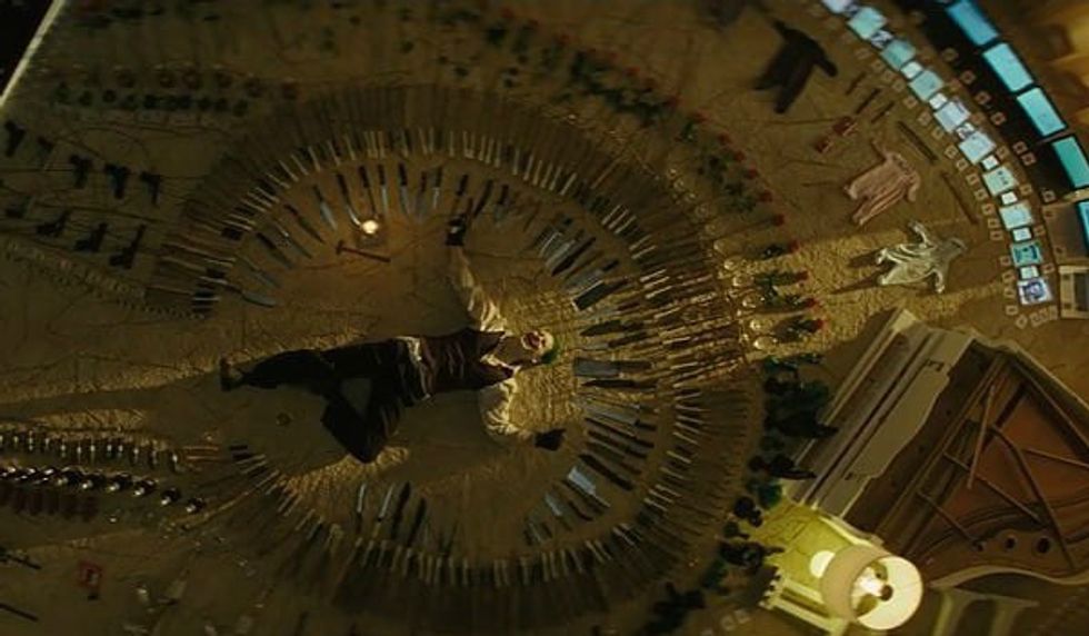 There was also a scene where the Joker was lying drunk on the floor, circled by knives, guns, and ... onesies? Could this also be hinting towards something?