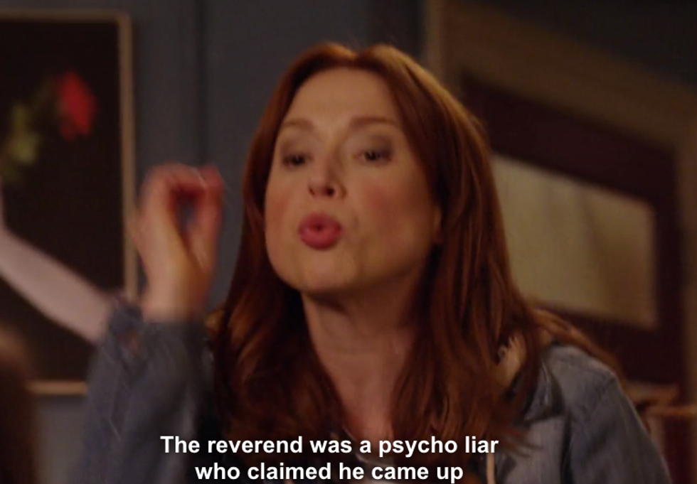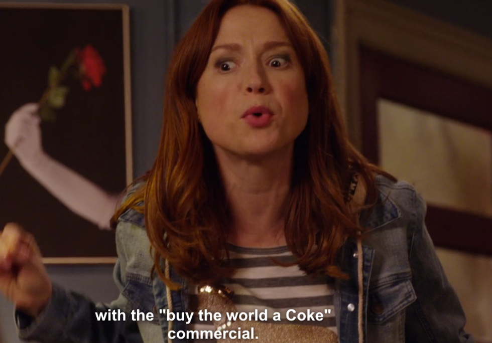 Later in the episode, Kimmy says tells other Mole Woman Gretchen that the Reverend claimed he came up with the “Buy The World a Coke” commercial, poking fun at the Mad Men series finale featuring the famous “Hilltop” Coca Cola ad. It’s meta stuff, and it reeks of Tina Fey.