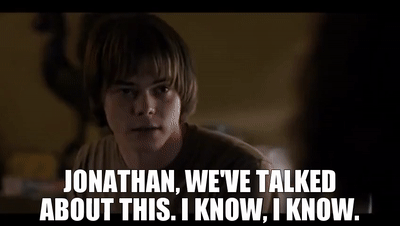 Plus, on the morning after Will was captured by the Demogorgon (but before anyone realized he was missing), it seemed like Joyce was insinuating (as evidenced in the above gif) that this is something that Jonathan does often, and that he keeps acting irresponsibly. Sure, they may need the extra money, but you know what they DON'T need? Child neglect charges. SMH.