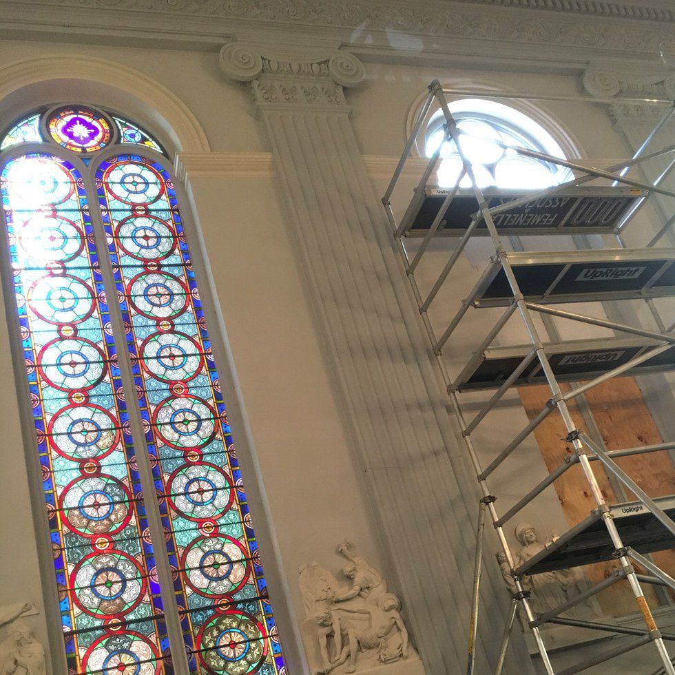 Holy Trinity Parish was undergoing renovation of stained glass windows and the students were greeted before and during Mass with the sound of drills, saws, hammering, and other loud noises. At the start of Mass, Fr. Simon Baker, OSB mentioned that he would not give a homily due to the loud noises of the construction surrounding us and that we might not hear parts of the liturgy. We Ravens know that a homily from Fr. Simon is not one to miss! So, as you could say it was just a normal pre-Mass experience. Mass was going good so far, right?