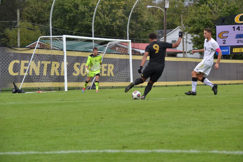 Xavier Tomlin (9) playing soccer for Centre College in Danville, KY.